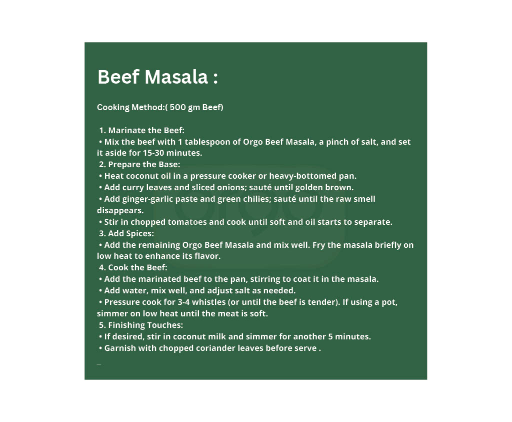 Beef Masala is a flavorful Indian curry made with beef and a rich blend of spices like cumin, coriander, turmeric, cinnamon, cloves, cardamom, and garam masala. The spices are combined with ingredients like onions, tomatoes, and garlic to create a hearty, aromatic dish.