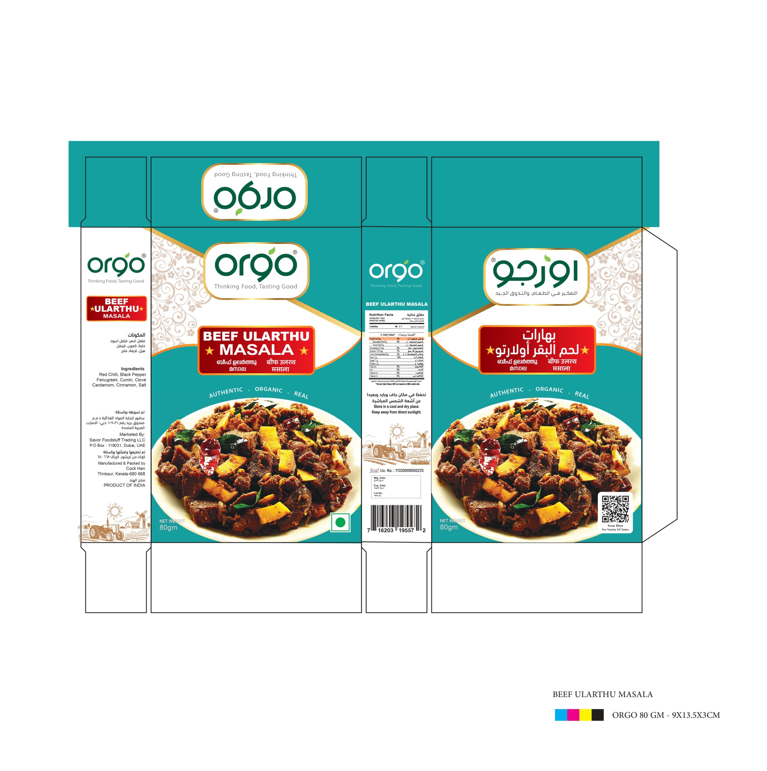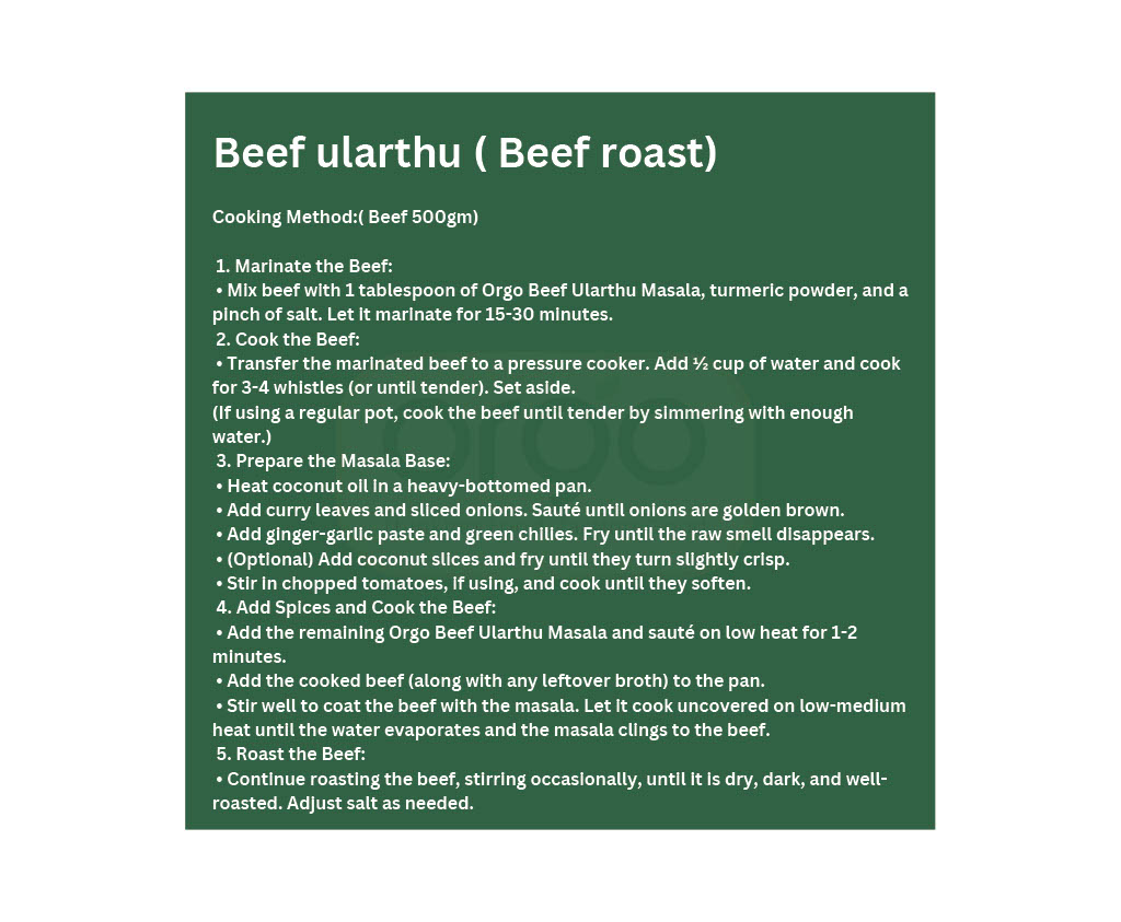 Beef Ularthu Masala is a traditional Kerala-style dry beef curry made by frying marinated beef with a mix of spices, curry leaves, and coconut oil. The beef is cooked until tender and coated with a thick, aromatic spice paste. Key ingredients often include turmeric, coriander, cumin, fennel, ginger, garlic, and green chilies.