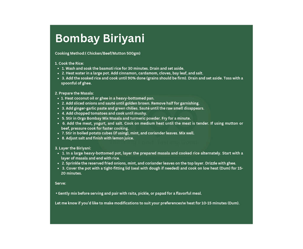 Bombay Biryani Mix is a specially curated blend of spices used to prepare a flavorful Bombay-style biryani. This mix typically includes spices like cumin, coriander, cinnamon, cardamom, cloves, nutmeg, and saffron, along with other ingredients like fried onions and rose water to create a unique and aromatic biryani.