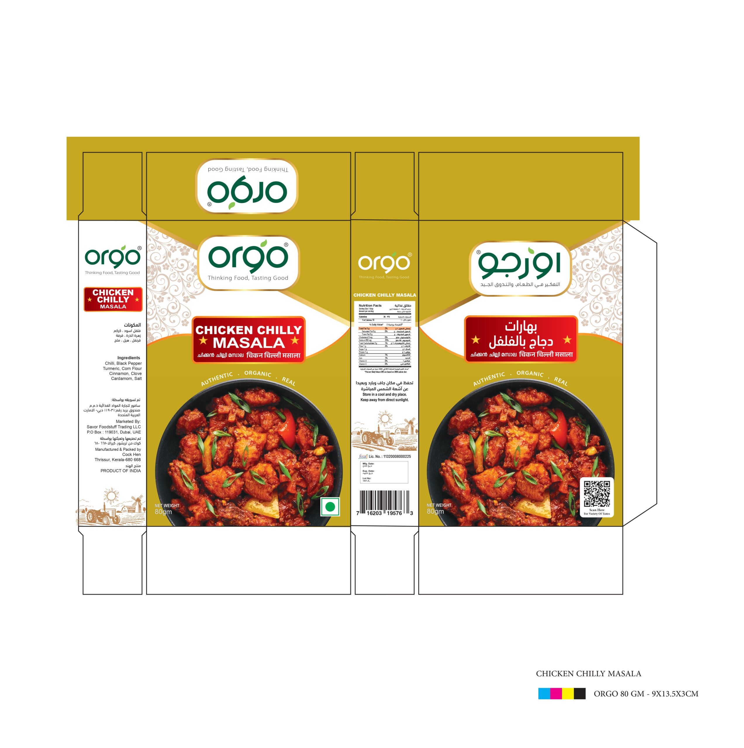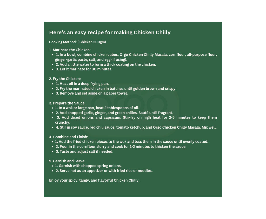 Chicken Chilly Masala is a spice blend designed to create a flavorful Indo-Chinese chicken dish. It includes a mix of chili powder, coriander, garlic, ginger, soy sauce powder, and sometimes a hint of sugar, delivering a perfect balance of heat, tanginess, and umami flavor. Ideal for stir-fried or gravy-based chicken dishes.