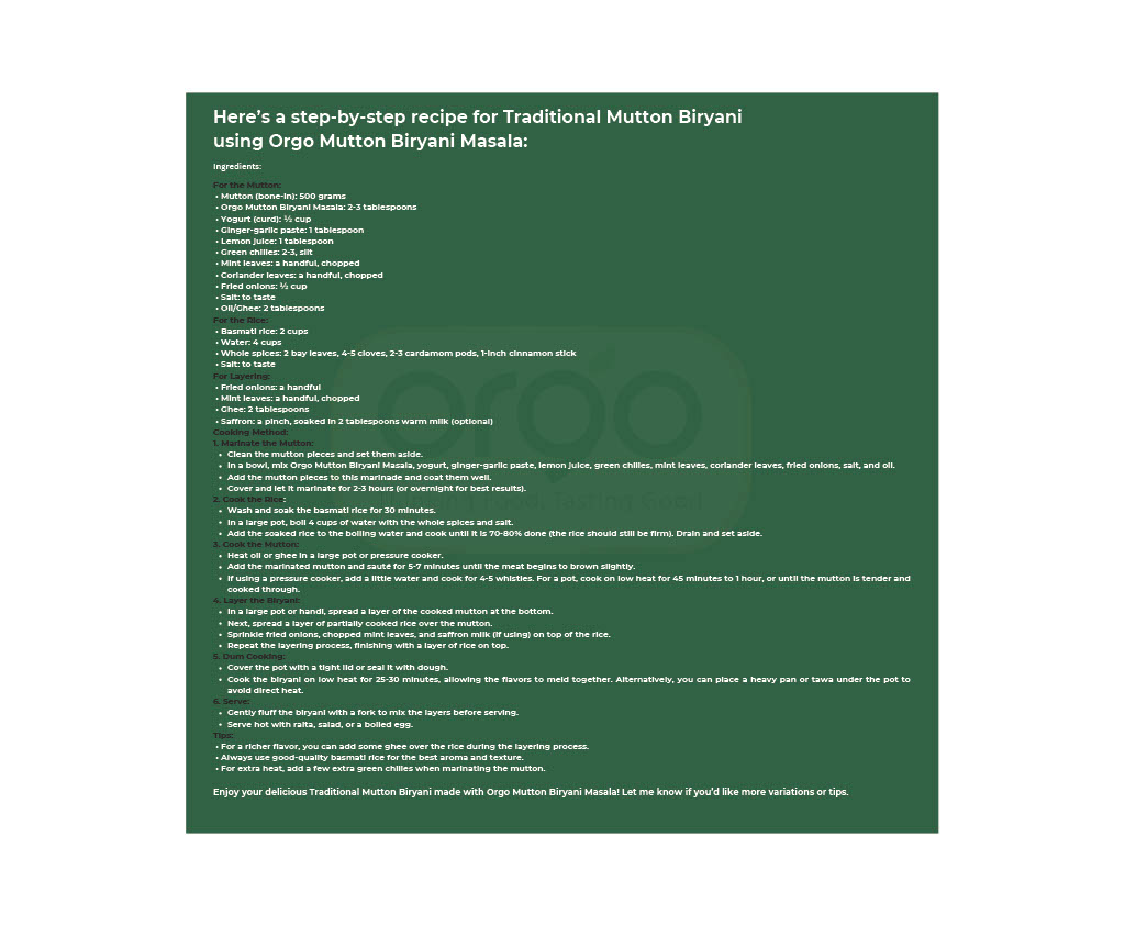Enjoy your delicious Traditional Mutton Biryani made with Orgo Mutton Biryani Masala! Let me know if you’d like more variations or tips.