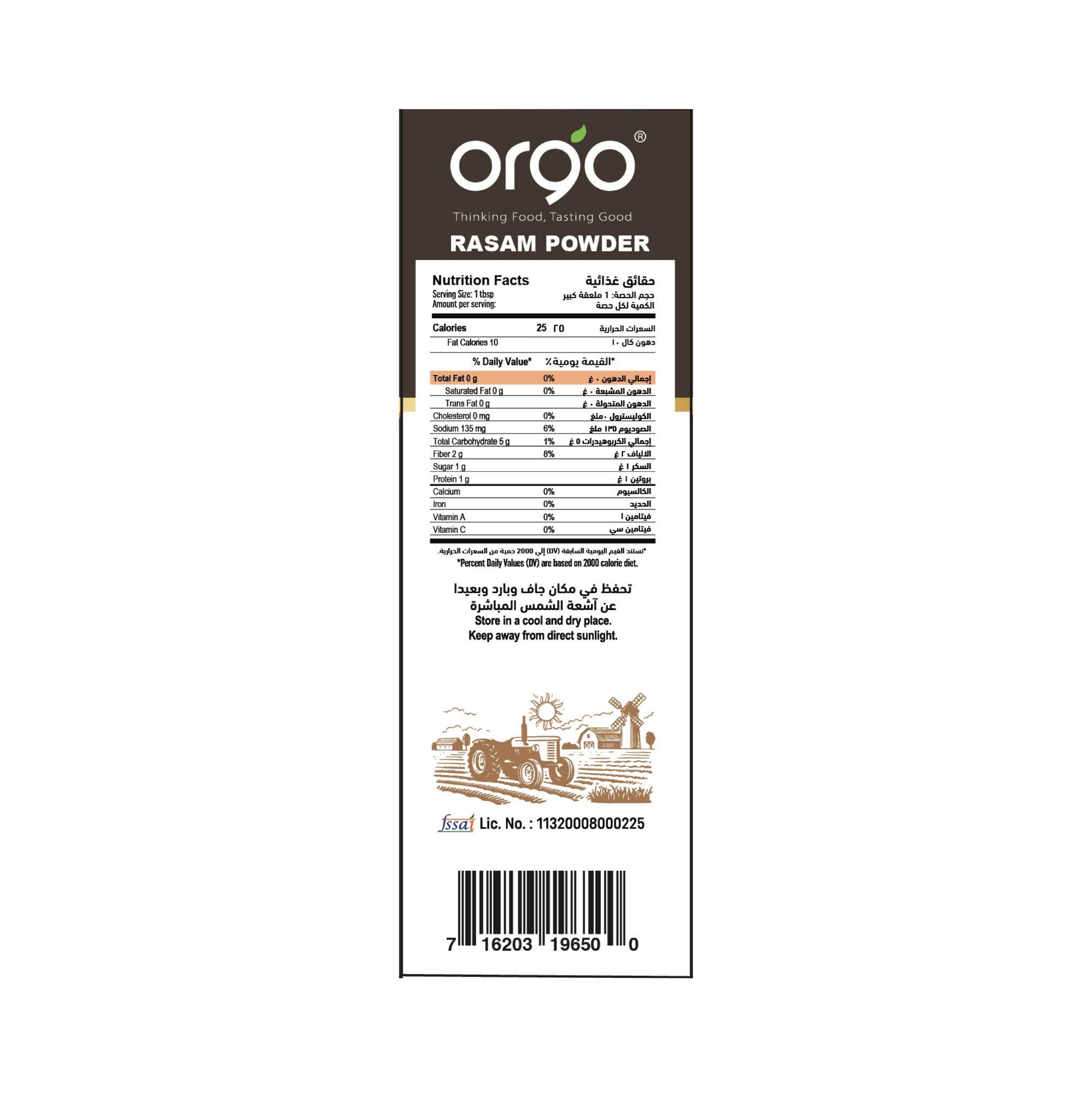 Rasam Masala is a spice blend used to prepare rasam, a South Indian tangy soup made with tamarind, tomatoes, and spices. It typically includes black pepper, cumin, coriander seeds, dry red chilies, curry leaves, fenugreek, and asafoetida, giving rasam its distinctive flavor.
