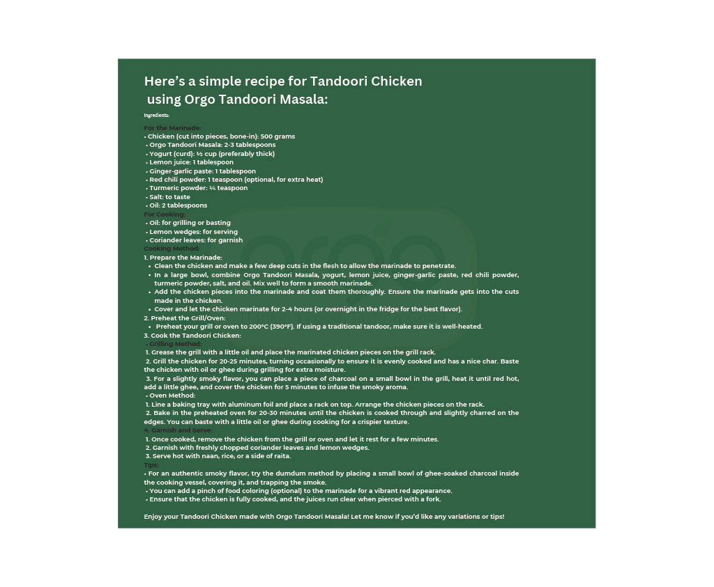 Enjoy your Tandoori Chicken made with Orgo Tandoori Masala! Let me know if you’d like any variations or tips!